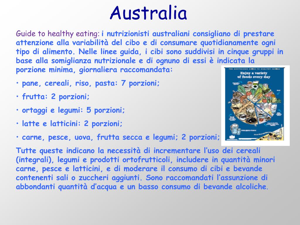 Australia • Guide to healthy eating:i nutrizionisti australiani consigliano di prestare attenzione alla variabilità del cibo e di consumare quotidianamente ogni tipo di alimento. Nelle linee guida, i cibi sono suddivisi in cinque gruppi in base alla somiglianza nutrizionale e di ognuno di essi è indicata la porzione minima, giornaliera raccomandata: • pane, cereali, riso, pasta: 7 porzioni; • frutta: 2 porzioni; • ortaggi e legumi: 5 porzioni; • latte e latticini: 2 porzioni; • carne, pesce, uova, frutta secca e legumi; 2 porzioni; • Tutte queste indicano la necessità di incrementare l’uso dei cereali (integrali), legumi e prodotti ortofrutticoli, includere in quantità minori carne, pesce e latticini, e di moderare il consumo di cibi e bevande contenenti sali o zuccheri aggiunti. Sono raccomandati l’assunzione di abbondanti quantità d’acqua e un basso consumo di bevande alcoliche.