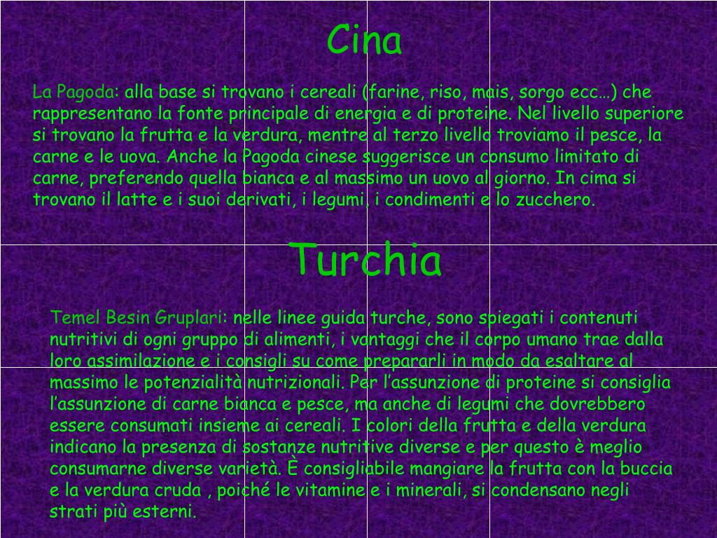 Cina La Pagoda: alla base si trovano i cereali (farine, riso, mais, sorgo ecc…) che rappresentano la fonte principale di energia e di proteine. Nel livello superiore si trovano la frutta e la verdura, mentre al terzo livello troviamo il pesce, la carne e le uova. Anche la Pagoda cinese suggerisce un consumo limitato di carne, preferendo quella bianca e al massimo un uovo al giorno. In cima si trovano il latte e i suoi derivati, i legumi, i condimenti e lo zucchero. Turchia Temel Besin Gruplari: nelle linee guida turche, sono spiegati i contenuti nutritivi di ogni gruppo di alimenti, i vantaggi che il corpo umano trae dalla loro assimilazione e i consigli su come prepararli in modo da esaltare al massimo le potenzialità nutrizionali. Per l’assunzione di proteine si consiglia l’assunzione di carne bianca e pesce, ma anche di legumi che dovrebbero essere consumati insieme ai cereali. I colori della frutta e della verdura indicano la presenza di sostanze nutritive diverse e per questo è meglio consumarne diverse varietà. È consigliabile mangiare la frutta con la buccia e la verdura cruda , poiché le vitamine e i minerali, si condensano negli strati più esterni.