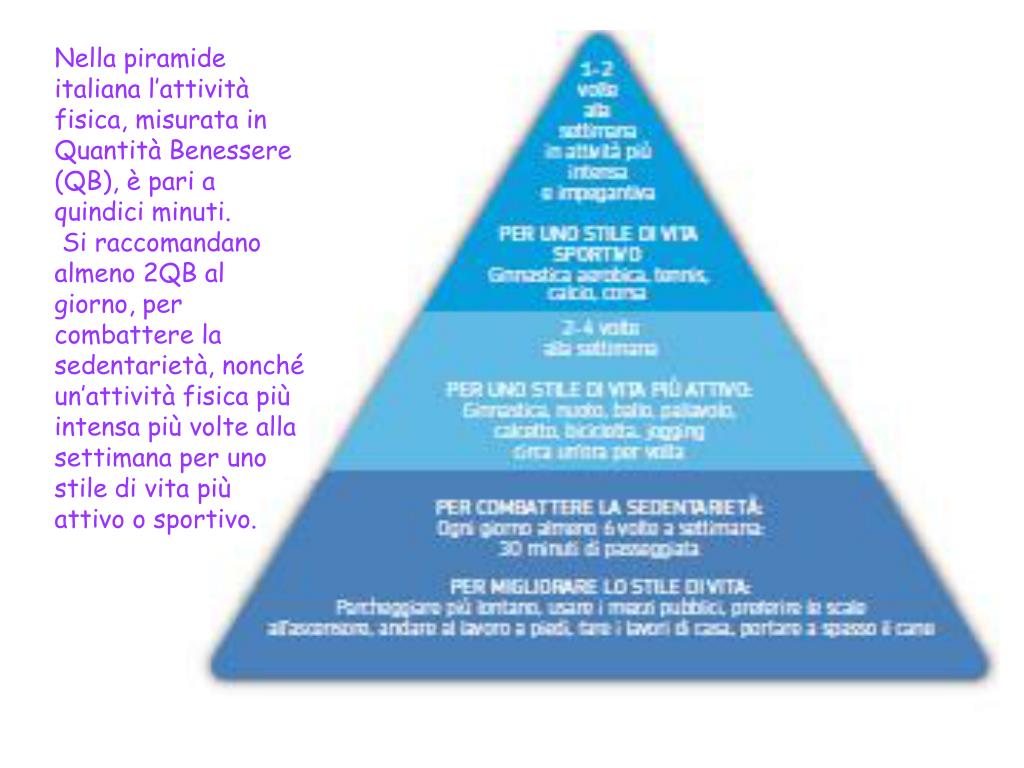 Nella piramide italiana l’attività fisica, misurata in Quantità Benessere (QB), è pari a quindici minuti. Si raccomandano almeno 2QB al giorno, per combattere la sedentarietà, nonché un’attività fisica più intensa più volte alla settimana per uno stile di vita più attivo o sportivo.