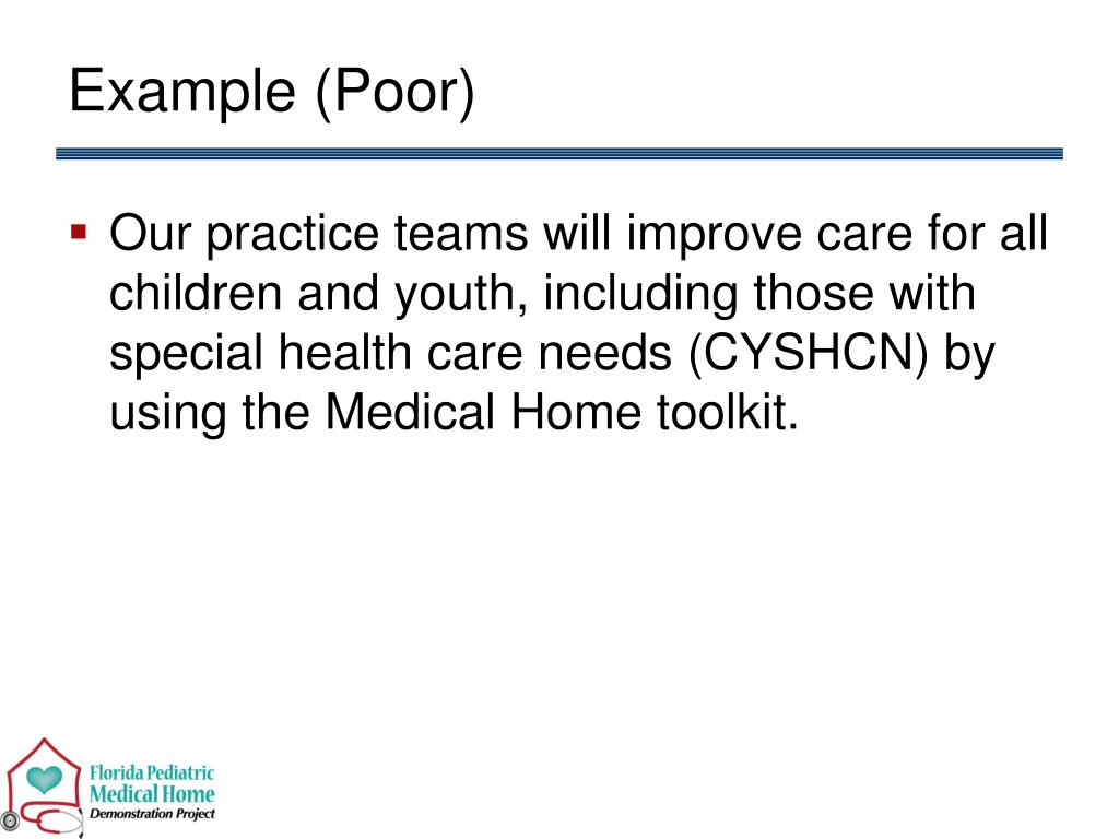 Example (Poor) Our practice teams will improve care for all children and youth, including those with special health care needs (CYSHCN) by using the Medical Home toolkit.