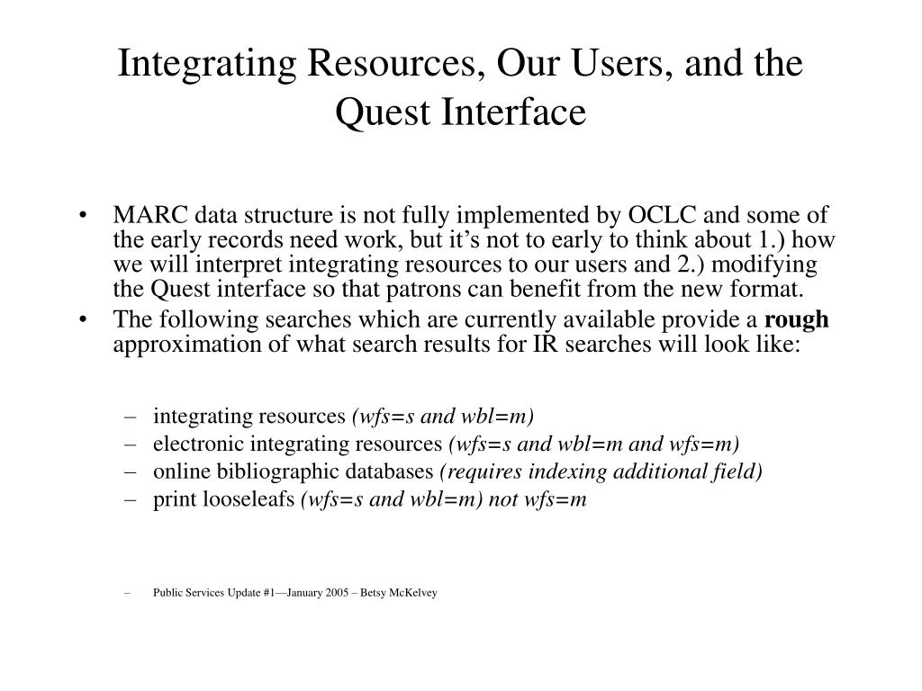 Integrating Resources, Our Users, and the Quest Interface • MARC data structure is not fully implemented by OCLC and some of the early records need work, but it’s not to early to think about 1.) how we will interpret integrating resources to our users and 2.) modifying the Quest interface so that patrons can benefit from the new format. • The following searches which are currently available provide a rough approximation of what search results for IR searches will look like: • integrating resources (wfs=s and wbl=m) • electronic integrating resources (wfs=s and wbl=m and wfs=m) • online bibliographic databases (requires indexing additional field) • print looseleafs (wfs=s and wbl=m) not wfs=m • Public Services Update #1—January 2005 – Betsy McKelvey