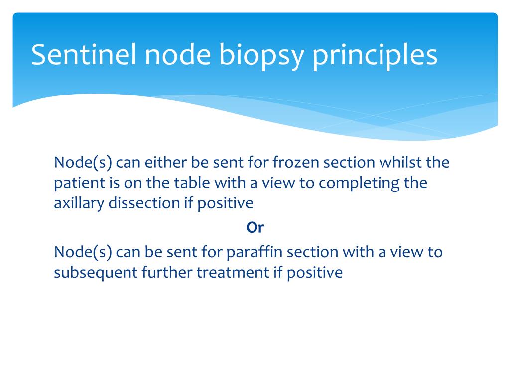 Sentinel node biopsy principles Node(s) can either be sent for frozen section whilst the patient is on the table with a view to completing the axillary dissection if positive Or Node(s) can be sent for paraffin section with a view to subsequent further treatment if positive