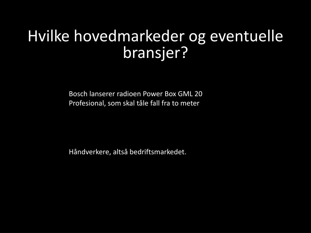 Hvilke hovedmarkeder og eventuelle bransjer? Bosch lanserer radioen Power Box GML 20 Profesional, som skal tåle fall fra to meter Håndverkere, altså bedriftsmarkedet.