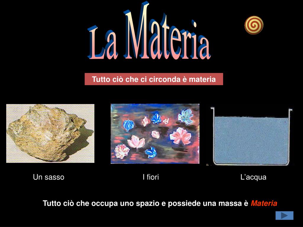 La Materia Tutto ciò che ci circonda è materia Un sasso I fiori L’acqua Tutto ciò che occupa uno spazio e possiede una massa è Materia