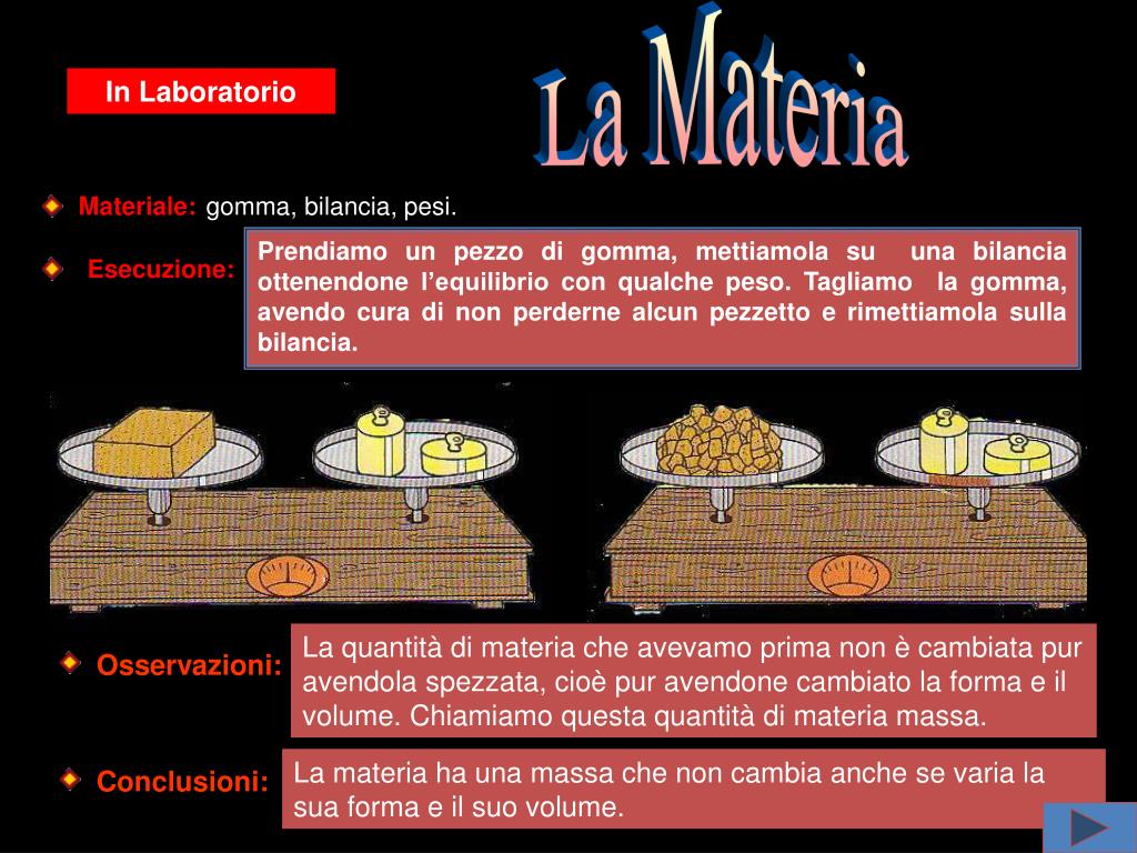 La Materia In Laboratorio Materiale: gomma, bilancia, pesi. Prendiamo un pezzo di gomma, mettiamola su una bilancia ottenendone l’equilibrio con qualche peso. Tagliamo la gomma, avendo cura di non perderne alcun pezzetto e rimettiamola sulla bilancia. Esecuzione: La quantità di materia che avevamo prima non è cambiata pur avendola spezzata, cioè pur avendone cambiato la forma e il volume. Chiamiamo questa quantità di materia massa. Osservazioni: La materia ha una massa che non cambia anche se varia la sua forma e il suo volume. Conclusioni: