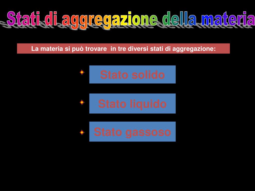 Stati di aggregazione della materia La materia si può trovare in tre diversi stati di aggregazione: Stato solido Stato liquido Stato gassoso