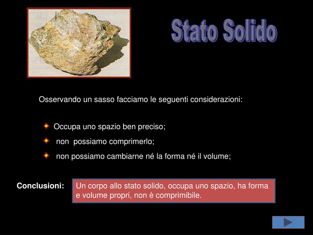 Stato Solido Osservando un sasso facciamo le seguenti considerazioni: Occupa uno spazio ben preciso; non possiamo comprimerlo; non possiamo cambiarne né la forma né il volume; Conclusioni: Un corpo allo stato solido, occupa uno spazio, ha forma e volume propri, non è comprimibile.