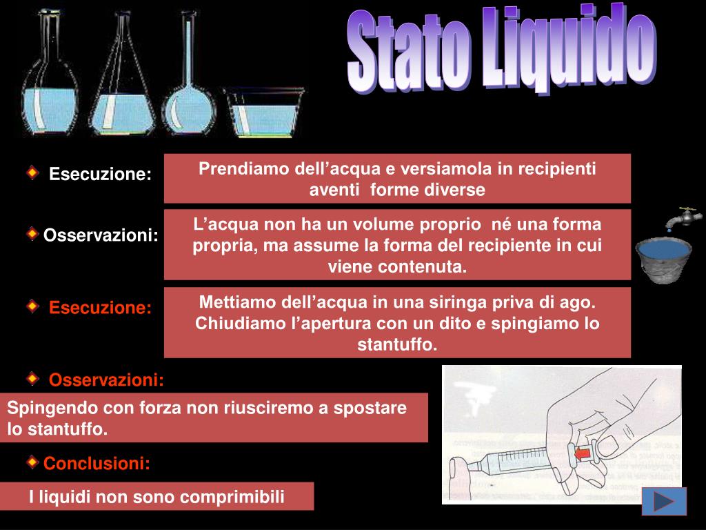 Stato Liquido Prendiamo dell’acqua e versiamola in recipienti aventi forme diverse Esecuzione: L’acqua non ha un volume proprio né una forma propria, ma assume la forma del recipiente in cui viene contenuta. Osservazioni: Mettiamo dell’acqua in una siringa priva di ago. Chiudiamo l’apertura con un dito e spingiamo lo stantuffo. Esecuzione: Osservazioni: Spingendo con forza non riusciremo a spostare lo stantuffo. Conclusioni: I liquidi non sono comprimibili