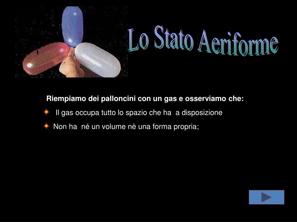 Lo Stato Aeriforme Riempiamo dei palloncini con un gas e osserviamo che: Il gas occupa tutto lo spazio che ha a disposizione Non ha né un volume nè una forma propria;