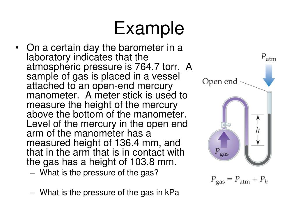Example • On a certain day the barometer in a laboratory indicates that the atmospheric pressure is 764.7 torr. A sample of gas is placed in a vessel attached to an open-end mercury manometer. A meter stick is used to measure the height of the mercury above the bottom of the manometer. Level of the mercury in the open end arm of the manometer has a measured height of 136.4 mm, and that in the arm that is in contact with the gas has a height of 103.8 mm. • What is the pressure of the gas? • What is the pressure of the gas in kPa