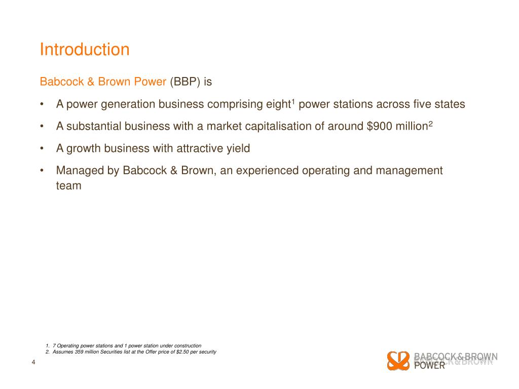 Introduction Babcock & Brown Power (BBP) is • A power generation business comprising eight1 power stations across five states • A substantial business with a market capitalisation of around $900 million2 • A growth business with attractive yield • Managed by Babcock & Brown, an experienced operating and management team 1. 7 Operating power stations and 1 power station under construction 2. Assumes 359 million Securities list at the Offer price of $2.50 per security