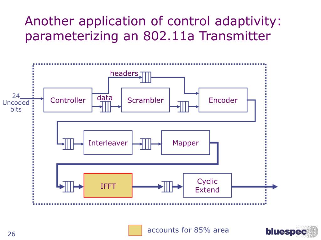 Cyclic Extend Controller Scrambler Encoder Interleaver Mapper IFFT accounts for 85% area Another application of control adaptivity: parameterizing an 802.11a Transmitter headers 24 Uncoded bits data