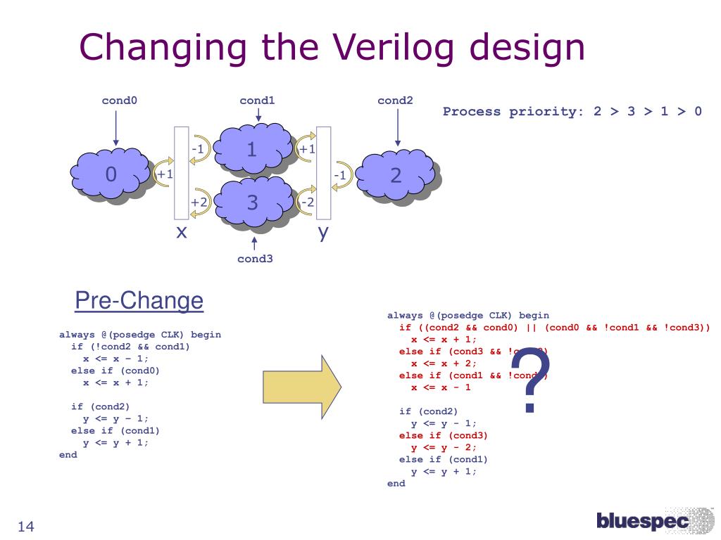 Changing the Verilog design cond0 cond1 cond2 Process priority: 2 > 3 > 1 > 0 1 -1 +1 0 2 +1 -1 3 +2 -2 x y cond3 Pre-Change always @(posedge CLK) begin if ((cond2 && cond0) || (cond0 && !cond1 && !cond3)) x <= x + 1; else if (cond3 && !cond2) x <= x + 2; else if (cond1 && !cond2) x <= x - 1 if (cond2) y <= y - 1; else if (cond3) y <= y - 2; else if (cond1) y <= y + 1; end ? always @(posedge CLK) begin if (!cond2 && cond1) x <= x – 1; else if (cond0) x <= x + 1; if (cond2) y <= y – 1; else if (cond1) y <= y + 1; end