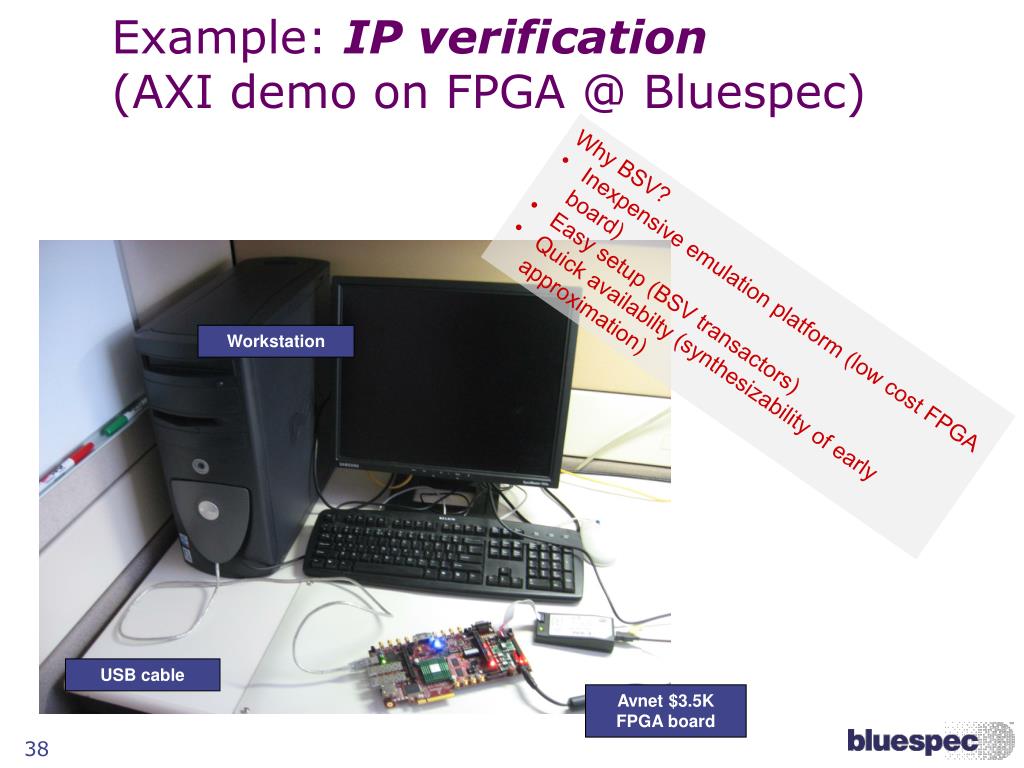 Example: IP verification(AXI demo on FPGA @ Bluespec) • Why BSV? • Inexpensive emulation platform (low cost FPGA board) • Easy setup (BSV transactors) • Quick availabilty (synthesizability of early approximation) Workstation USB cable Avnet $3.5K FPGA board