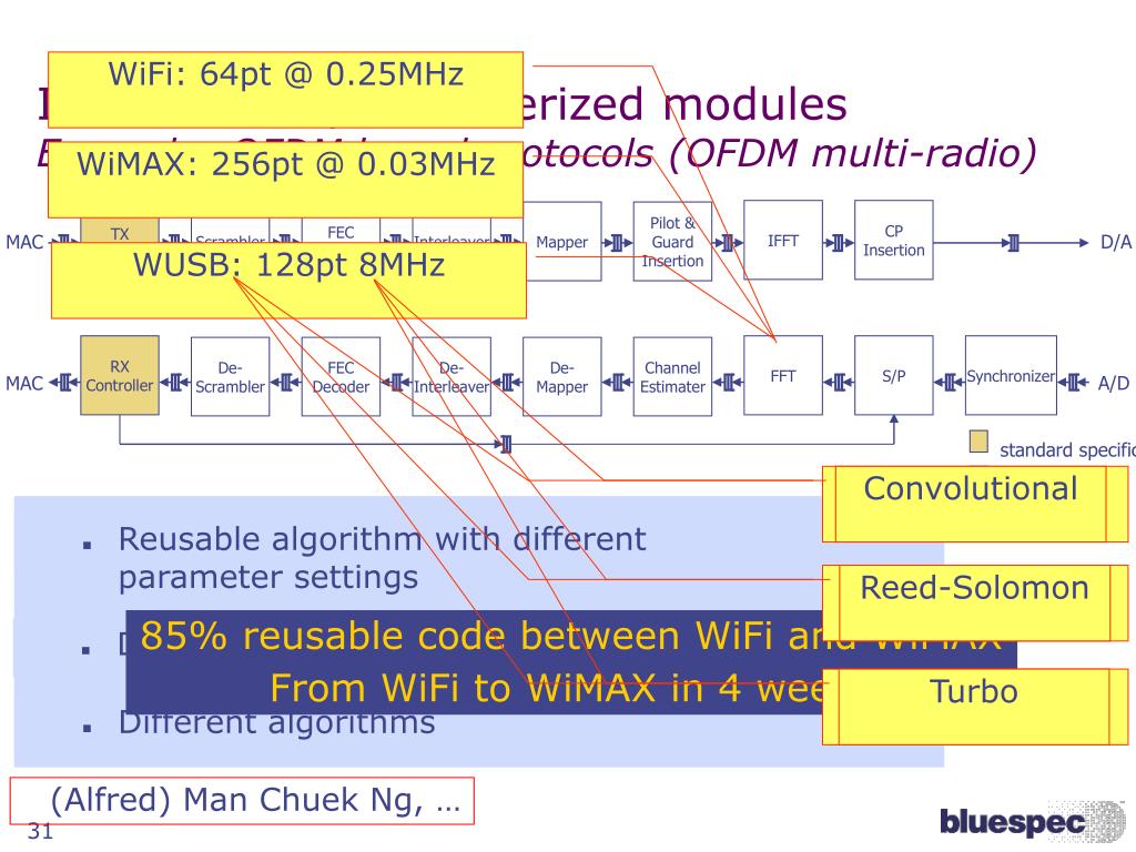 WiFi: 64pt @ 0.25MHz WiMAX: 256pt @ 0.03MHz IFFT CP Insertion Scrambler FEC Encoder Interleaver Mapper Pilot & Guard Insertion TX Controller WUSB: 128pt 8MHz RX Controller FFT S/P Synchronizer De- Scrambler FEC Decoder De- Interleaver De- Mapper Channel Estimater WiFi:x7+x4+1 Convolutional WiMAX:x15+x14+1 Reed-Solomon WUSB:x15+x14+1 Turbo IP Reuse via parameterized modulesExample: OFDM based protocols (OFDM multi-radio) D/A MAC A/D MAC standard specific potential reuse • Reusable algorithm with different parameter settings 85% reusable code between WiFi and WiMAX From WiFi to WiMAX in 4 weeks • Different throughput requirements • Different algorithms • (Alfred) Man Chuek Ng, …