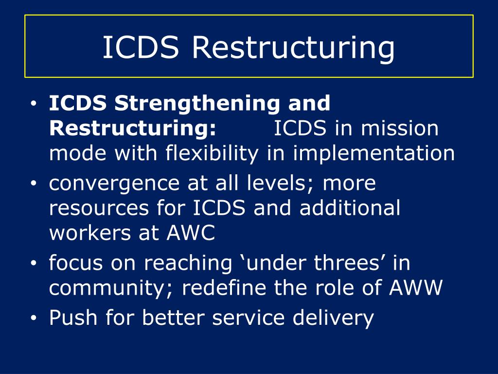 ICDS Restructuring • ICDS Strengthening and Restructuring: ICDS in mission mode with flexibility in implementation • convergence at all levels; more resources for ICDS and additional workers at AWC • focus on reaching ‘under threes’ in community; redefine the role of AWW • Push for better service delivery