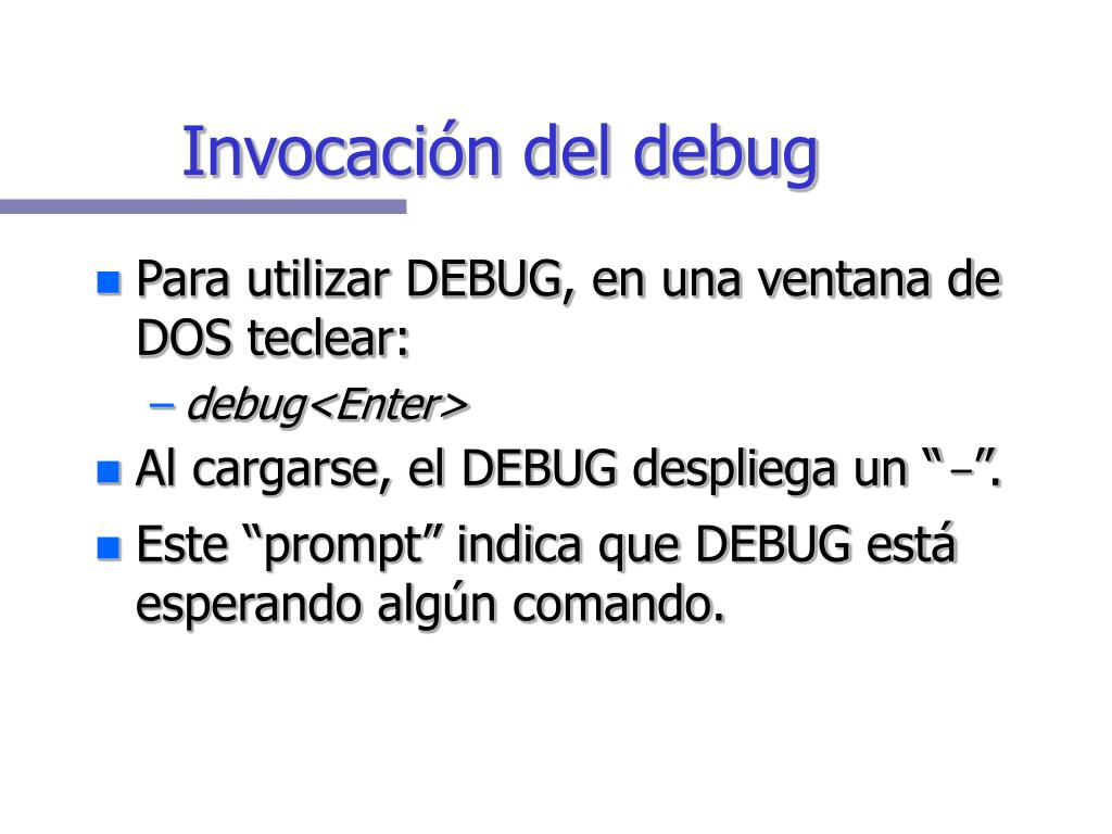 Invocación del debug • Para utilizar DEBUG, en una ventana de DOS teclear: • debug<Enter> • Al cargarse, el DEBUG despliega un “-”. • Este “prompt” indica que DEBUG está esperando algún comando.