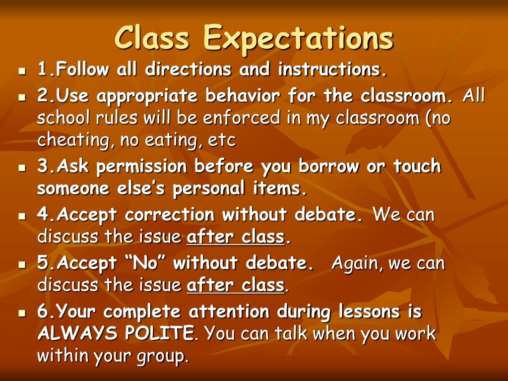Class Expectations • 1.Follow all directions and instructions. • 2.Use appropriate behavior for the classroom. All school rules will be enforced in my classroom (no cheating, no eating, etc • 3.Ask permission before you borrow or touch someone else’s personal items. • 4.Accept correction without debate. We can discuss the issue after class. • 5.Accept “No” without debate. Again, we can discuss the issue after class. • 6.Your complete attention during lessons is ALWAYS POLITE. You can talk when you work within your group.