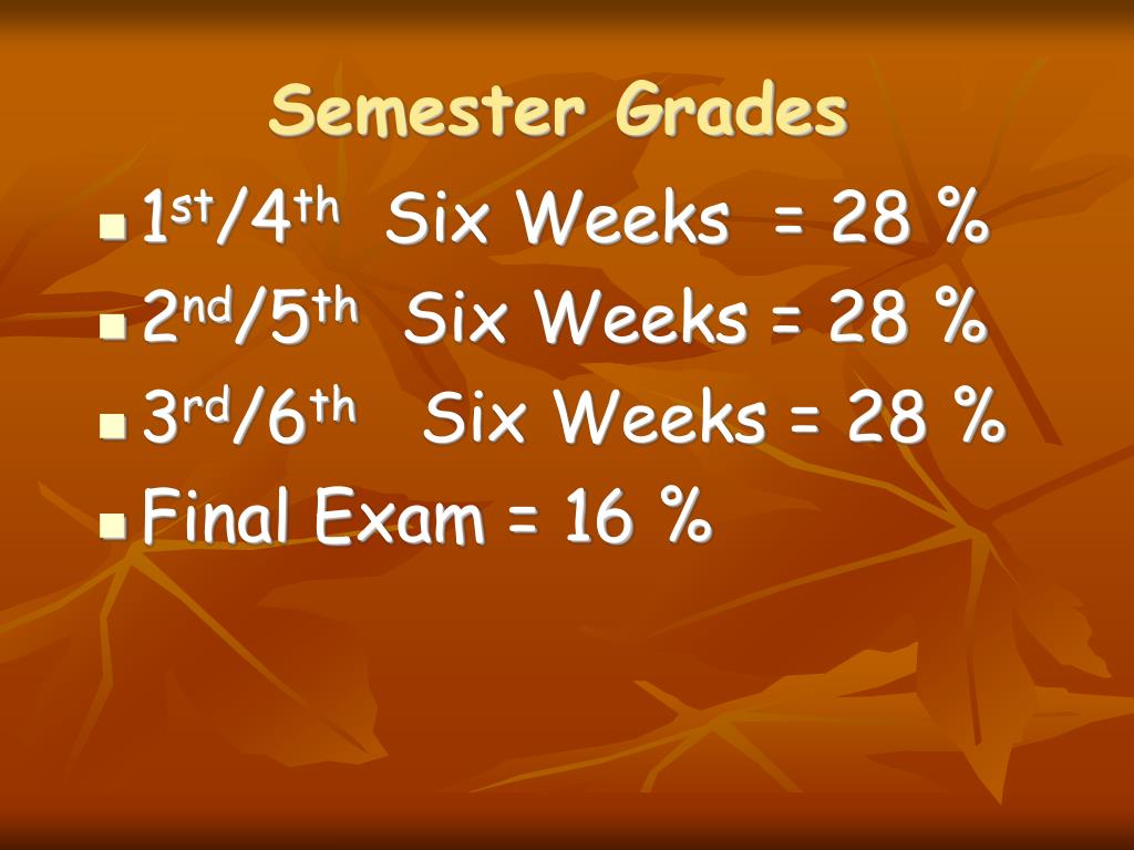 Semester Grades 1st/4thSix Weeks = 28 % 2nd/5thSix Weeks = 28 % 3rd/6thSix Weeks = 28 % Final Exam = 16 %