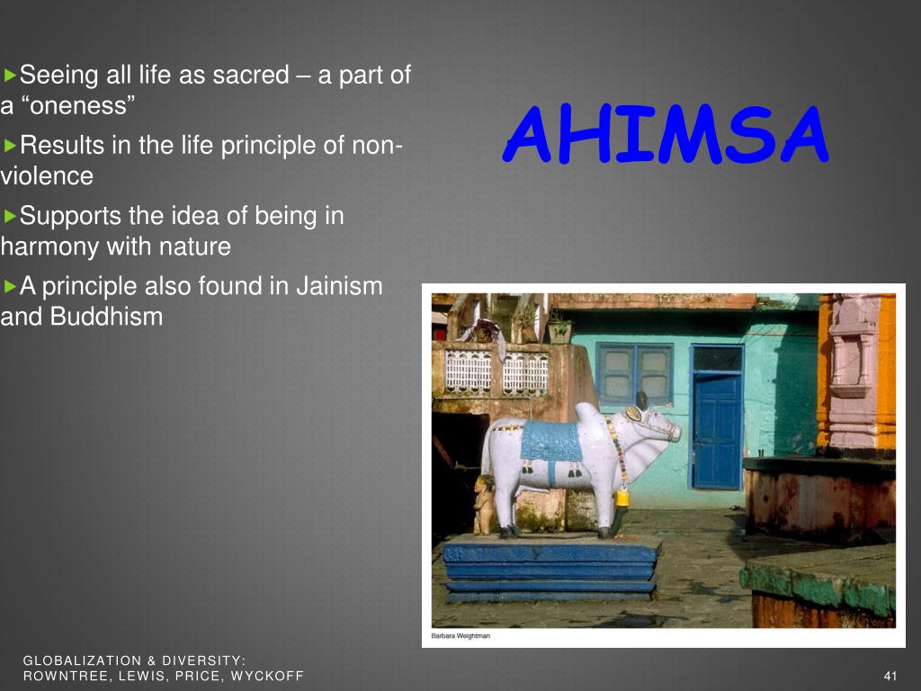 Ahimsa • Seeing all life as sacred – a part of a “oneness” • Results in the life principle of non-violence • Supports the idea of being in harmony with nature • A principle also found in Jainism and Buddhism Globalization & Diversity: Rowntree, Lewis, Price, Wyckoff