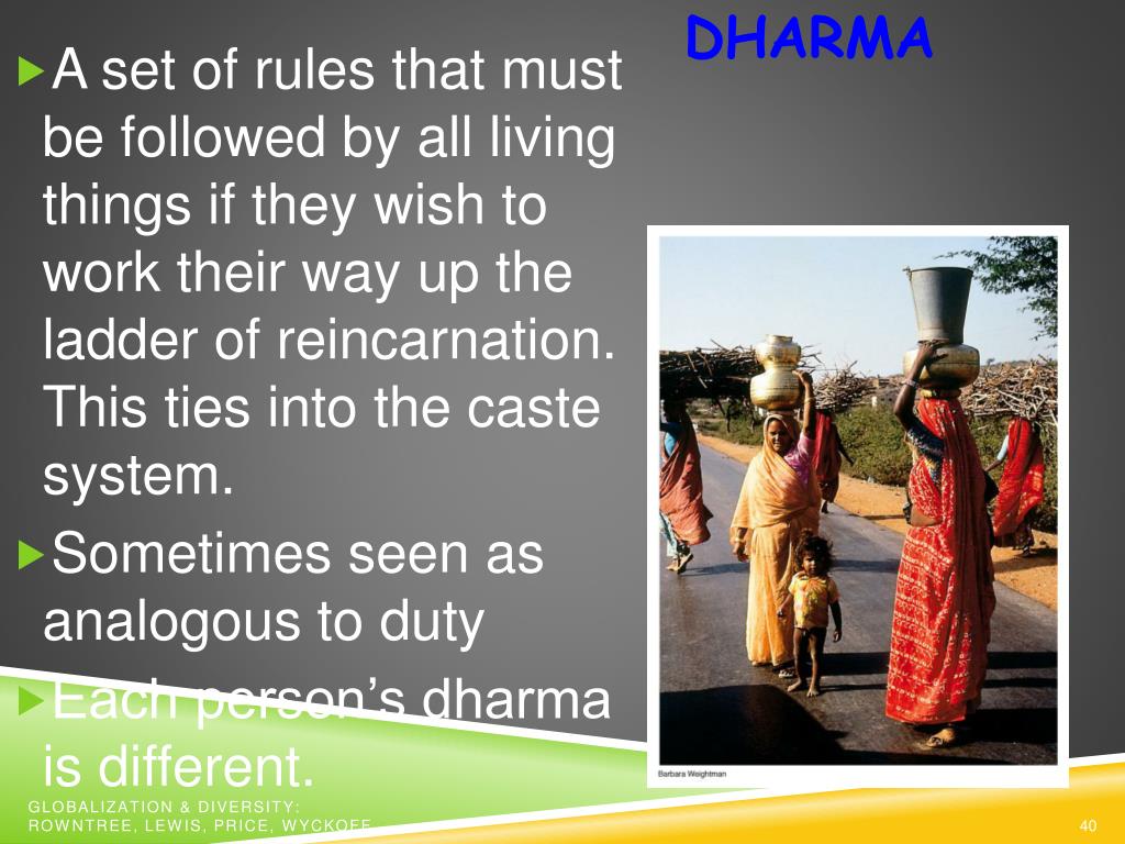 DHARMA • A set of rules that must be followed by all living things if they wish to work their way up the ladder of reincarnation. This ties into the caste system. • Sometimes seen as analogous to duty • Each person’s dharma is different. Globalization & Diversity: Rowntree, Lewis, Price, Wyckoff