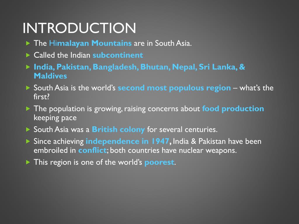 Introduction • The Himalayan Mountains are in South Asia. • Called the Indian subcontinent • India, Pakistan, Bangladesh, Bhutan, Nepal, Sri Lanka, & Maldives • South Asia is the world’s second most populous region – what’s the first? • The population is growing, raising concerns about food production keeping pace • South Asia was a British colony for several centuries. • Since achieving independence in 1947, India & Pakistan have been embroiled in conflict; both countries have nuclear weapons. • This region is one of the world’s poorest.