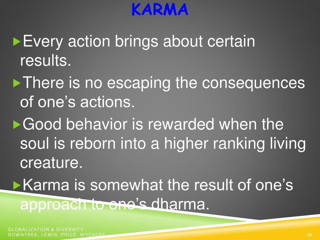 KARMA • Every action brings about certain results. • There is no escaping the consequences of one’s actions. • Good behavior is rewarded when the soul is reborn into a higher ranking living creature. • Karma is somewhat the result of one’s approach to one’s dharma. Globalization & Diversity: Rowntree, Lewis, Price, Wyckoff