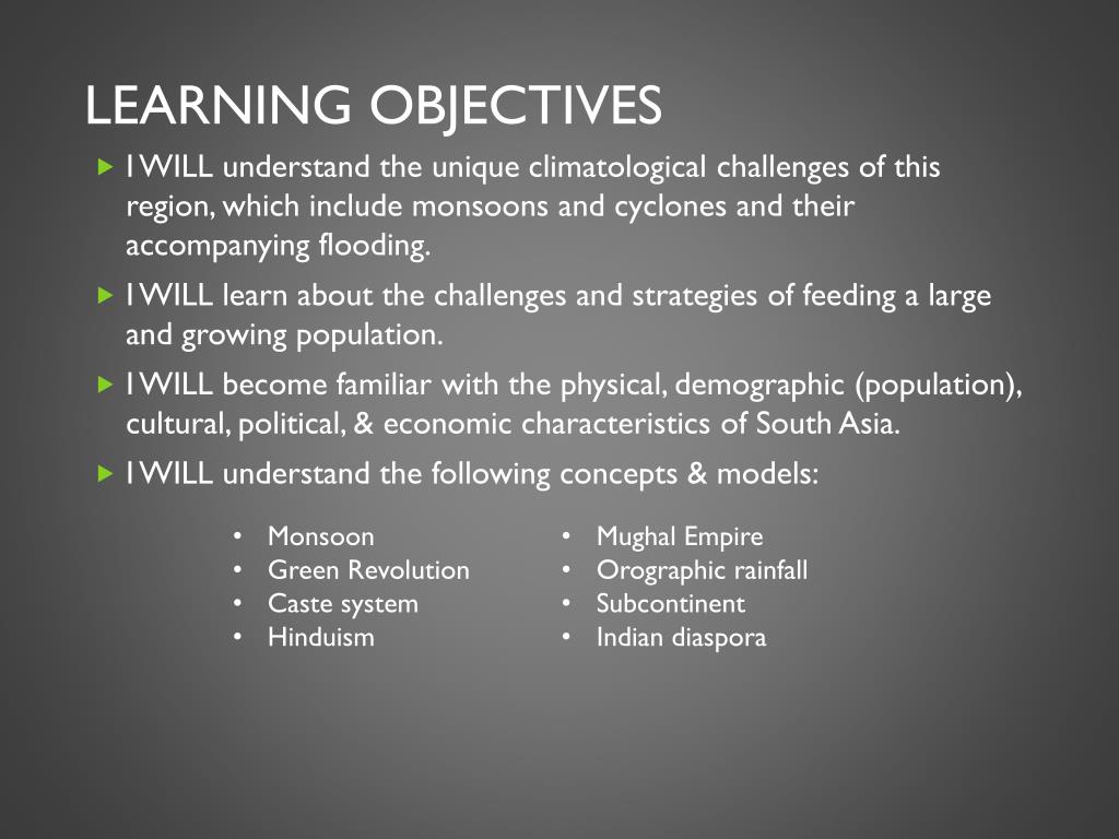 South Asia. Physical & Human Geography. South Asia. Learning Objectives. I WILL understand the unique climatological challenges of this region, which include monsoons and cyclones and their accompanying flooding.