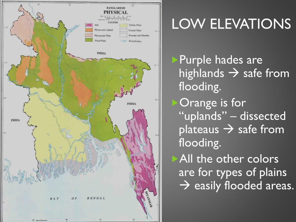 Low Elevations • Purple hades are highlands safe from flooding. • Orange is for “uplands” – dissected plateaus safe from flooding. • All the other colors are for types of plains easily flooded areas.