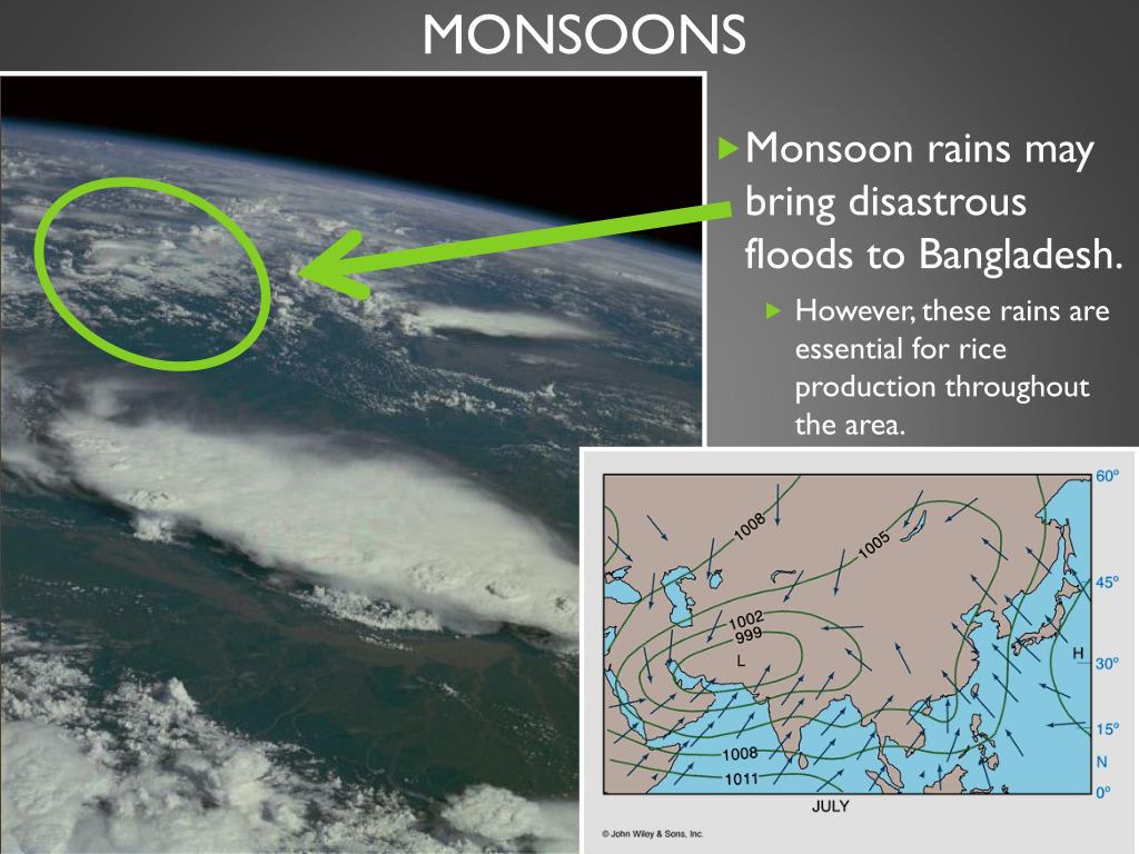 monsoons • Monsoon rains may bring disastrous floods to Bangladesh. • However, these rains are essential for rice production throughout the area.