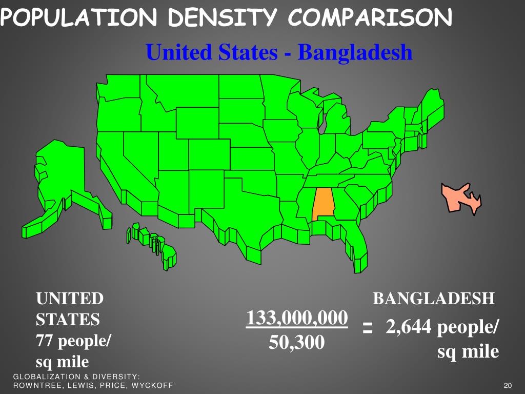 United States - Bangladesh POPULATION DENSITY COMPARISON UNITED STATES 77people/ sqmile BANGLADESH 133,000,000 50,300 2,644people/ sqmile Globalization & Diversity: Rowntree, Lewis, Price, Wyckoff