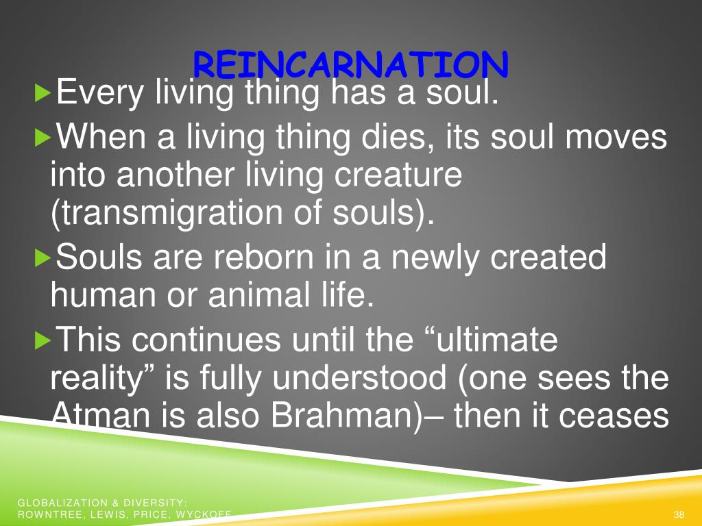 REINCARNATION • Every living thing has a soul. • When a living thing dies, its soul moves into another living creature (transmigration of souls). • Souls are reborn in a newly created human or animal life. • This continues until the “ultimate reality” is fully understood (one sees the Atman is also Brahman)– then it ceases Globalization & Diversity: Rowntree, Lewis, Price, Wyckoff
