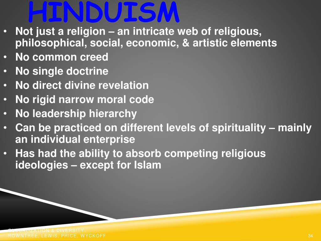 HINDUISM • Not just a religion – an intricate web of religious, philosophical, social, economic, & artistic elements • No common creed • No single doctrine • No direct divine revelation • No rigid narrow moral code • No leadership hierarchy • Can be practiced on different levels of spirituality – mainly an individual enterprise • Has had the ability to absorb competing religious ideologies – except for Islam Globalization & Diversity: Rowntree, Lewis, Price, Wyckoff