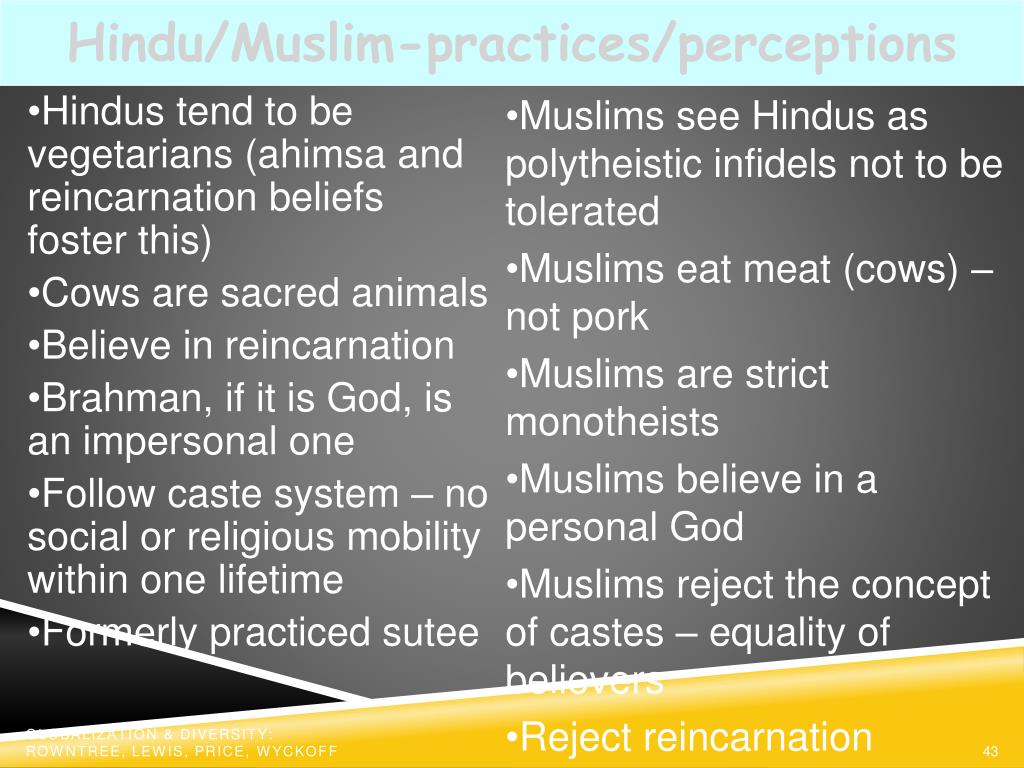 Hindu/Muslim-practices/perceptions • Hindus tend to be vegetarians (ahimsa and reincarnation beliefs foster this) • Cows are sacred animals • Believe in reincarnation • Brahman, if it is God, is an impersonal one • Follow caste system – no social or religious mobility within one lifetime • Formerly practiced sutee • Muslims see Hindus as polytheistic infidels not to be tolerated • Muslims eat meat (cows) – not pork • Muslims are strict monotheists • Muslims believe in a personal God • Muslims reject the concept of castes – equality of believers • Reject reincarnation Globalization & Diversity: Rowntree, Lewis, Price, Wyckoff