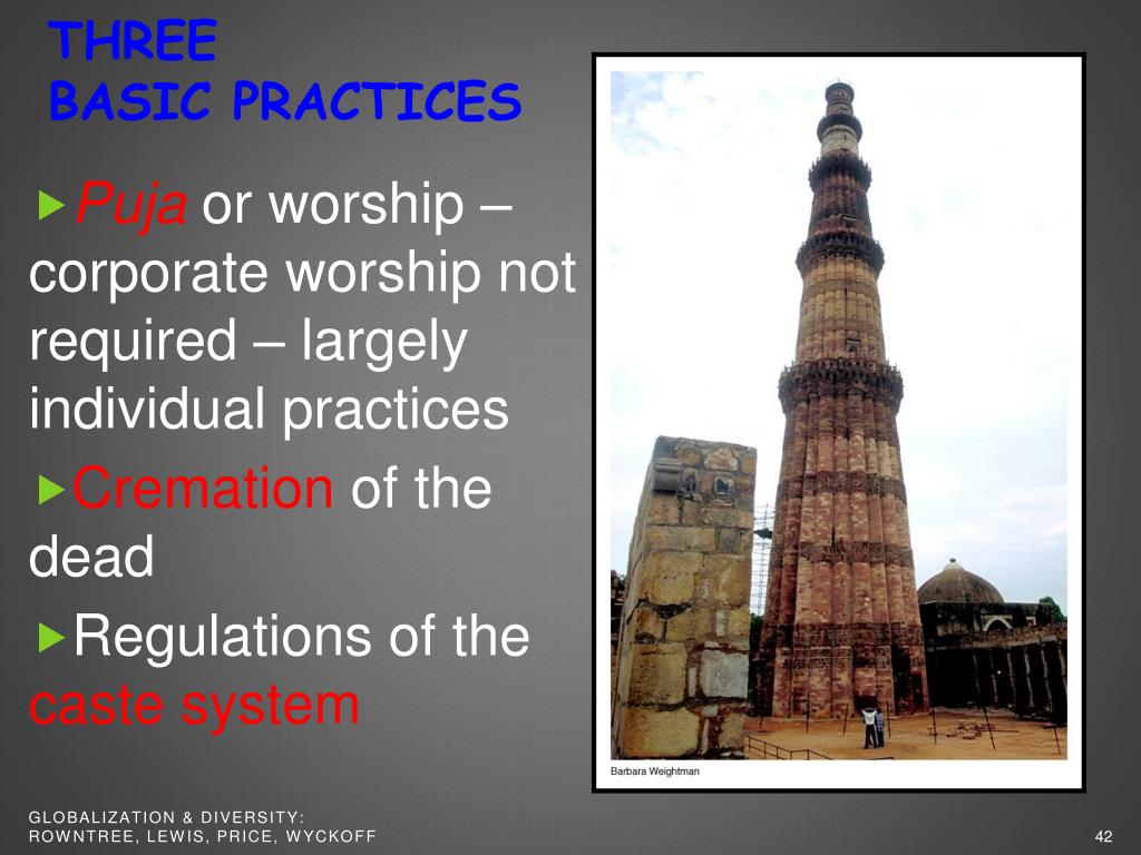 THREE BASIC PRACTICES • Puja or worship – corporate worship not required – largely individual practices • Cremation of the dead • Regulations of the caste system Globalization & Diversity: Rowntree, Lewis, Price, Wyckoff
