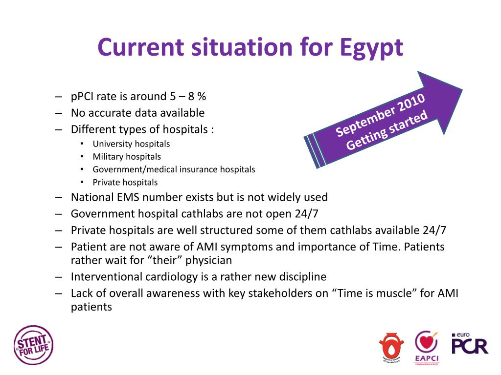 Stent for Life Project – Egypt Objectives • Integrate SFL into National Cardiology Program • Build Regional Network and Infrastructure (EMS) • Optimize Cath Lab Staffing and Work Organization • Allocate Budget (Procedure reimbursement & 24/7 staff remuneration) • Establish National ACS/AMI Registry • Increase Disease Awareness (Educational campaign to government, payers and lay public) • EMS staff training is more important that the EMS staff structure (trained nurses suitable for the triage and transport of AMI patients) • EMS ambulances: equipped by resuscitation facilities and by a portable 12-leads ECG. • Raising public awareness about heart attacks and importance to reach the nearest medical centre. • Criteria of selection of patient receiving PCI for SFL program. • Create a database of current PPCI practice patterns in Egypt in order to serve as a benchmark for further assessment. • Improve the performance of centers doing PPCI. • Adequate training of ER & all concerned staff. • Increase patients awareness of the seriousness of chest pain & the dangers of delaying adequate medical care. • Improving emergency services with regional maps for different centers.