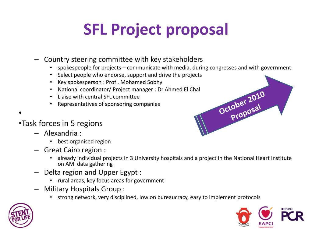 SFL Project proposal • Country steering committee with key stakeholders • spokespeople for projects – communicate with media, during congresses and with government • Select people who endorse, support and drive the projects • Key spokesperson : Prof . Mohamed Sobhy • National coordinator/ Project manager : Dr Ahmed El Chal • Liaise with central SFL committee • Representatives of sponsoring companies • Task forces in 5 regions • Alexandria : • best organised region • Great Cairo region : • already individual projects in 3 University hospitals and a project in the National Heart Institute on AMI data gathering • Delta region and Upper Egypt : • rural areas, key focus areas for government • Military Hospitals Group : • strong network, very disciplined, low on bureaucracy, easy to implement protocols October 2010 Proposal