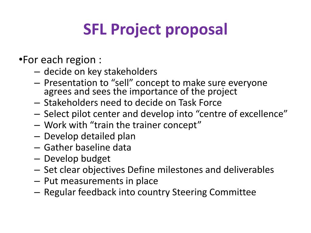 SFL Project proposal • For each region : • decide on key stakeholders • Presentation to “sell” concept to make sure everyone agrees and sees the importance of the project • Stakeholders need to decide on Task Force • Select pilot center and develop into “centre of excellence” • Work with “train the trainer concept” • Develop detailed plan • Gather baseline data • Develop budget • Set clear objectives Define milestones and deliverables • Put measurements in place • Regular feedback into country Steering Committee