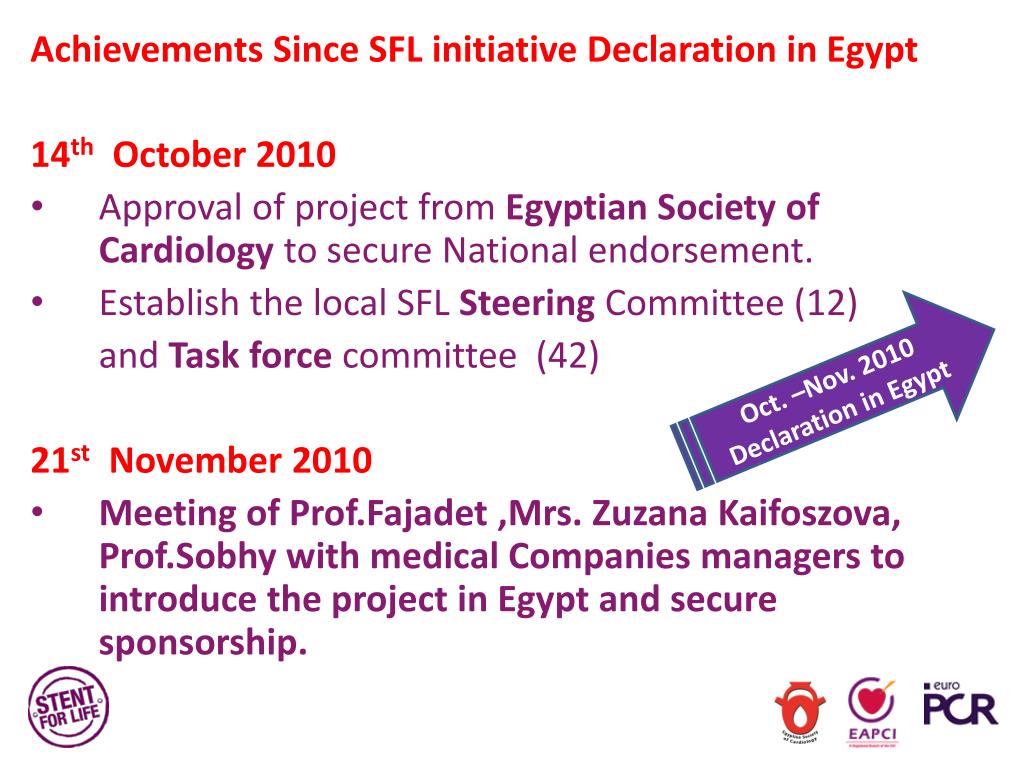 Achievements Since SFL initiative Declaration in Egypt 14th October 2010 • Approval of project from Egyptian Society of Cardiology to secure National endorsement. • Establish the local SFL Steering Committee (12) • and Task force committee (42) • 21st November 2010 • Meeting of Prof.Fajadet ,Mrs. Zuzana Kaifoszova, Prof.Sobhy with medical Companies managers to introduce the project in Egypt and secure sponsorship. Oct. –Nov. 2010 Declaration in Egypt