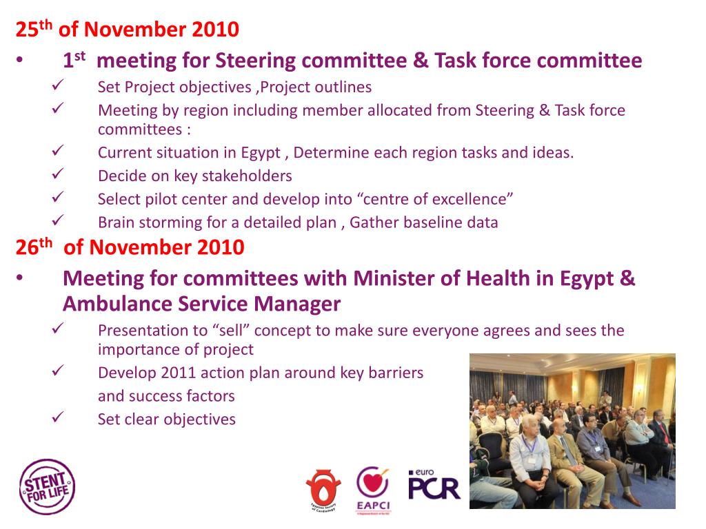 12th of May 2011 • 2nd meeting for Steering committee & Task force committee Plan of Action- Strategy All details to be achieved over 3 quarters of the year instead of 4. Working in all Network items in same time. Start a media campaign in same time to gain all positive effects from Egyptian revolution . Unifying cost of pPCI (Companies-Medical insurance) April 2011 Regain our Action Plan