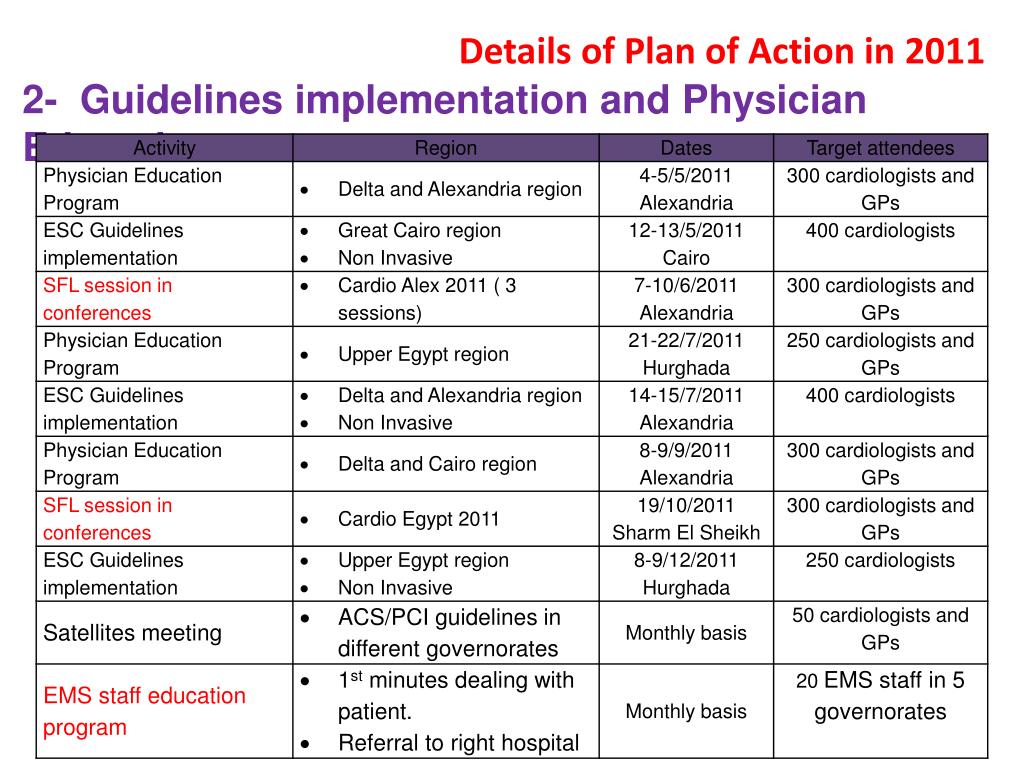 Details of Plan of Action in 2011 • 2- Guidelines implementation and Physician Education