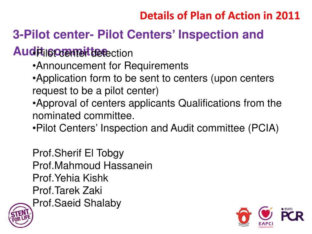Details of Plan of Action in 2011 3-Pilot center- Pilot Centers’ Inspection and Audit committee • Pilot center detection • Announcement for Requirements • Application form to be sent to centers (upon centers request to be a pilot center) • Approval of centers applicants Qualifications from the nominated committee. • Pilot Centers’ Inspection and Audit committee (PCIA) • Prof.Sherif El Tobgy • Prof.Mahmoud Hassanein • Prof.Yehia Kishk • Prof.Tarek Zaki • Prof.Saeid Shalaby