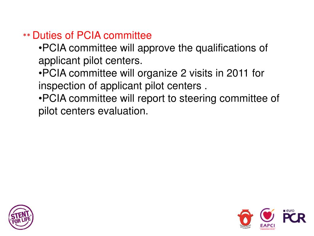 ** Duties of PCIA committee • PCIA committee will approve the qualifications of applicant pilot centers. • PCIA committee will organize 2 visits in 2011 for inspection of applicant pilot centers . • PCIA committee will report to steering committee of pilot centers evaluation.