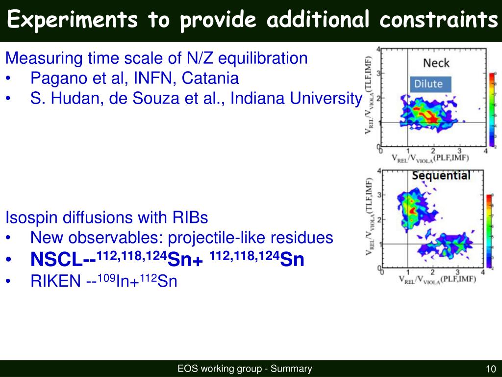 Experiments to provide additional constraints • Measuring time scale of N/Z equilibration • Pagano et al, INFN, Catania • S. Hudan, de Souza et al., Indiana University • Isospin diffusions with RIBs • New observables: projectile-like residues • NSCL--112,118,124Sn+112,118,124Sn • RIKEN --109In+112Sn EOS working group - Summary
