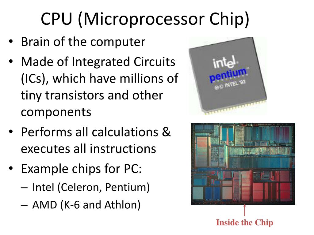 Inside the Chip CPU (Microprocessor Chip) • Brain of the computer • Made of Integrated Circuits (ICs), which have millions of tiny transistors and other components • Performs all calculations & executes all instructions • Example chips for PC: • Intel (Celeron, Pentium) • AMD (K-6 and Athlon)