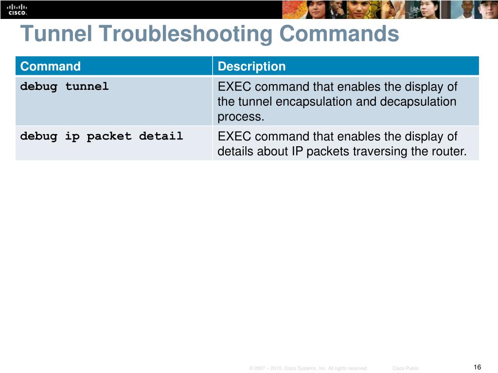 Manual Tunnel Configuration • Create a tunnel interface. Router(config)# interface tunnel number Creates a tunnel interface which is virtual. Once in interface configuration mode, configure the tunnel parameters including: IP address Tunnel source Tunnel destination Tunnel mode (type of tunnel)