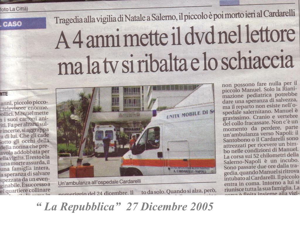 “ La Repubblica” 27 Dicembre 2005. EUROPA • In Europa, nel 2004, 42.000 bambini e adolescenti (0-19 anni) sono morti a causa di un incidente (in media 18.4 per 100.000 bambini) • Ogni giorno 115 bambini perdono la vita per cause accidentali in buona parte prevenibili