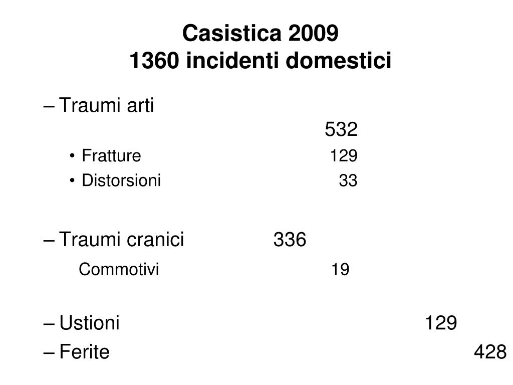 Casistica 20091360 incidenti domestici • Traumi arti 532 • Fratture 129 • Distorsioni 33 • Traumi cranici 336 Commotivi 19 • Ustioni 129 • Ferite 428