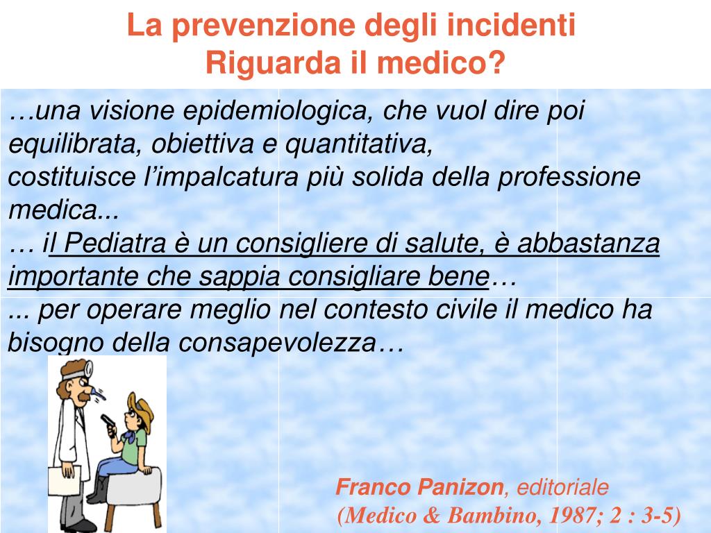 La prevenzione degli incidenti Riguarda il medico? …una visione epidemiologica, che vuol dire poi equilibrata, obiettiva e quantitativa, costituisce l’impalcatura più solida della professione medica... … il Pediatra è un consigliere di salute, è abbastanza importante che sappia consigliare bene… ... per operare meglio nel contesto civile il medico ha bisogno della consapevolezza… Franco Panizon, editoriale (Medico & Bambino, 1987; 2 : 3-5)