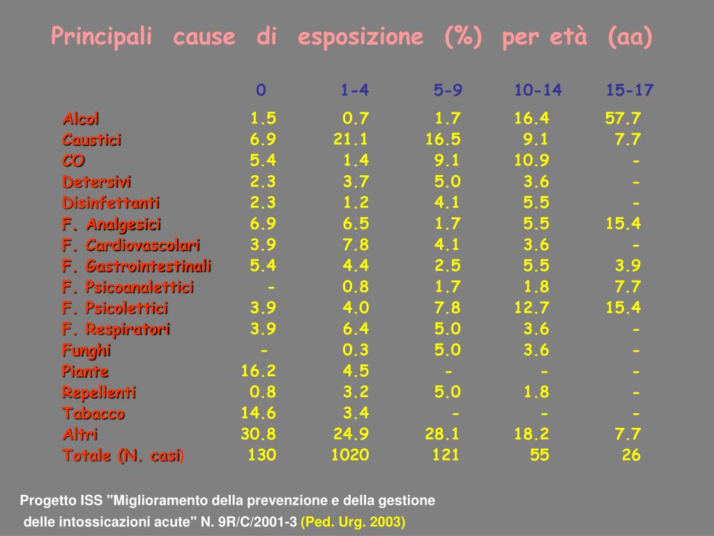 Principali cause di esposizione (%) per età (aa) 0 1-4 5-9 10-14 15-17 Alcol Caustici CO Detersivi Disinfettanti F. Analgesici F. Cardiovascolari F. Gastrointestinali F. Psicoanalettici F. Psicolettici F. Respiratori Funghi Piante Repellenti Tabacco Altri Totale (N. casi) 1.5 6.9 5.4 2.3 2.3 6.9 3.9 5.4 - 3.9 3.9 - 16.2 0.8 14.6 30.8 130 0.7 21.1 1.4 3.7 1.2 6.5 7.8 4.4 0.8 4.0 6.4 0.3 4.5 3.2 3.4 24.9 1020 1.7 16.5 9.1 5.0 4.1 1.7 4.1 2.5 1.7 7.8 5.0 5.0 - 5.0 - 28.1 121 16.4 9.1 10.9 3.6 5.5 5.5 3.6 5.5 1.8 12.7 3.6 3.6 - 1.8 - 18.2 55 57.7 7.7 - - - 15.4 - 3.9 7.7 15.4 - - - - - 7.7 26 Progetto ISS "Miglioramento della prevenzione e della gestione delle intossicazioni acute" N. 9R/C/2001-3 (Ped. Urg. 2003)